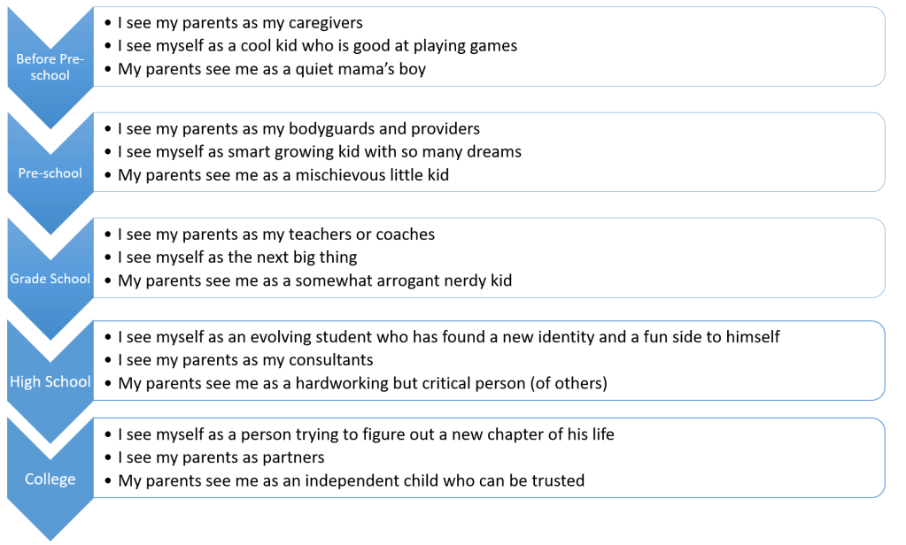 When I was young, I used to always ask my parents about everything since I was a very curious child. I thought of them as teachers since they would share to me how the world worked and what I have yet to learn. They were the ones who I learned from the most. In high school, however, I started to challenge what they said and no longer looked to them not as teachers but simply consultants. I learned more on my own. I would ask for their opinion but I wouldn’t consider it necessarily correct and I became fond of challenging my father to intellectual debates. Their ideas were no longer perfect. Now, since I no longer live with my parents, they’re more of partners who I can no longer consult with as often but can still guide me and help me in my large endeavors in college.